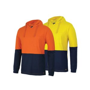 Our hi vis hoodie range typically features bright, compliant colours such as fluorescent yellow, orange, and two-tone designs with navy or black. These options ensure your workers remain highly visible while aligning with your business or industry requirements.