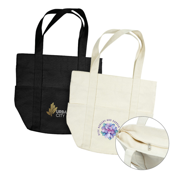 Classic canvas tote bag which is manufactured from 50% natural 440gsm cotton and 50% Polyester Canvas. It has a metal zip closure is concealed and can be hidden to ensure your belongings are safe. Other features include side pockets and front and back pockets for optimum storage.