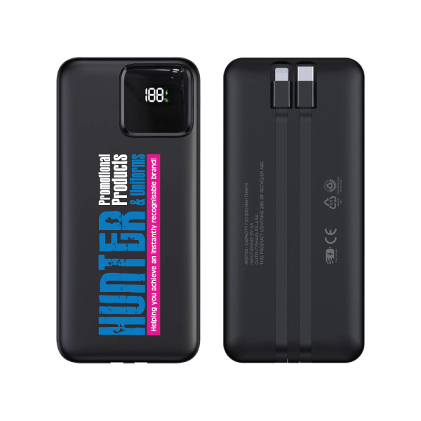 The Collins Eco power bank keeps your devices charged with its powerful 20,000 mAh A-grade lithium-polymer battery. It features integrated Lightning and Type-C cables, plus Quick Charge USB-A and Type-C ports for charging two devices at once. Made from 28% recycled ABS, it includes a digital power display and built-in protection against overcharging and short circuits. Supplied with a Type-C cable and user manual.