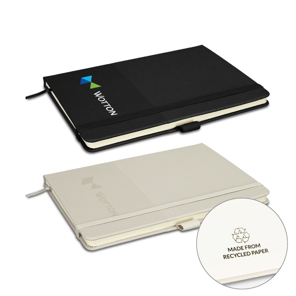 Made almost entirely from recycled materials, this stylish notebook features an RCS-certified recycled PU cover with a modern textured design. The inner pages are made from GRS-certified recycled lined paper perfect for lists, notes or keeping track of everyday plans. Enhanced with practical details including a ribbon bookmark, elastic closure band, and pen loop, it ensures your notes stay organised and accessible wherever you go.