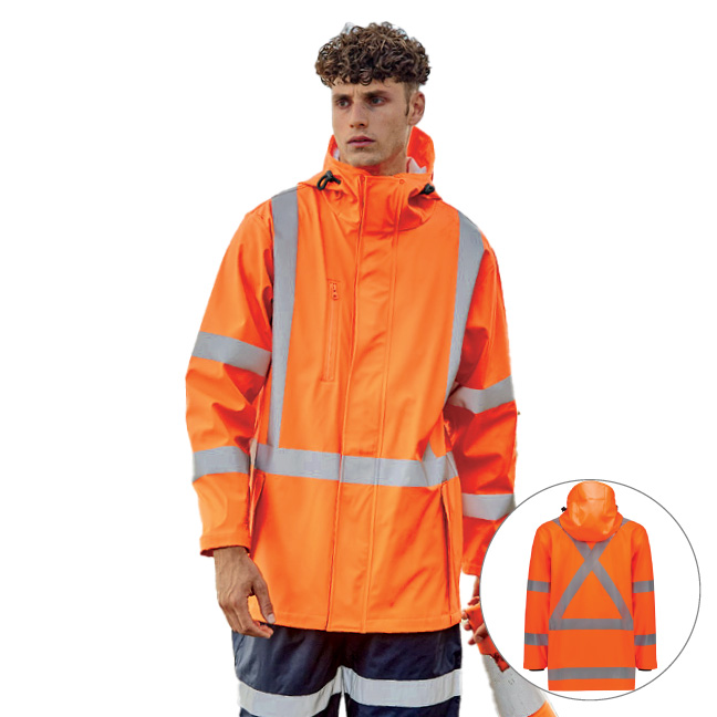 Stay dry and visible with the Syzmik Men’s Hi Vis X Back Ultralite Waterproof Jacket. Made from 100% 300D Oxford Polyester, this jacket is waterproof and seam-sealed, boasting a 10,000mm waterproof rating suitable for lighter rain and moderate conditions. It features a mesh lining, chin guard, and concealed adjustable hood and cuffs for added comfort. The reflective tape and Bio Motion arm taping ensure high visibility, while multiple pockets provide practical storage. Ideal for tough work environments, this jacket combines functionality with safety.