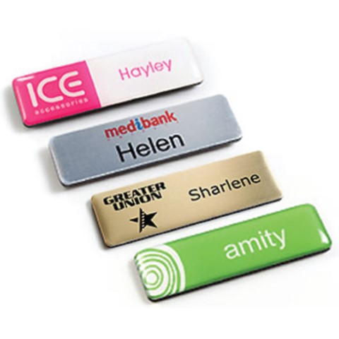 • Hunter Promotional Products supplies high-quality metal name badges from our Brisbane showroom. We offer a choice of finishes—including flat non-reflective, resin-domed or gel-glaze—plus pin or magnetic fasteners, so your staff badges look professional and stay secure.