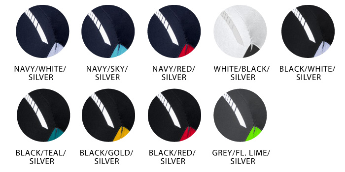 | Colours | Black/Gold/Silver, Black/Red/Silver*, Black/Teal/Silver*, Black/White/Silver*, Grey/Fl. Lime/Silver, Navy/Red/Silver*, Navy/Sky/Silver, Navy/White/Silver, White/Black/Silver* |