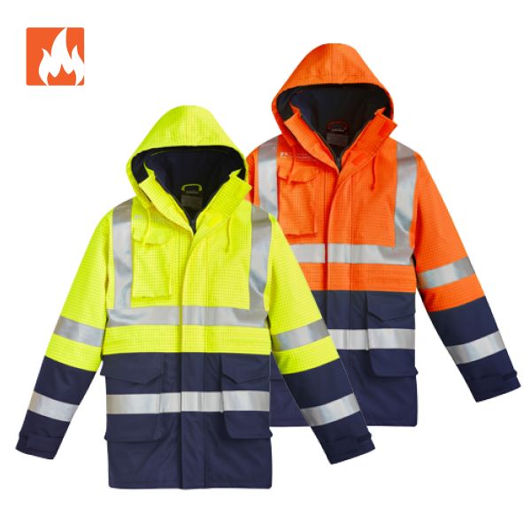This Syzmik Jacket is made from a waterproof polyester oxford, carbon fibre outer with an FR ARC rated finish. It is fully seam-sealed and has a waterproof rating of 5,000mm. The jacket also features a heat-resistant FR Zip and a warm Modacylic/Cotton FR lining. It has two covered waist pockets with FR closure.